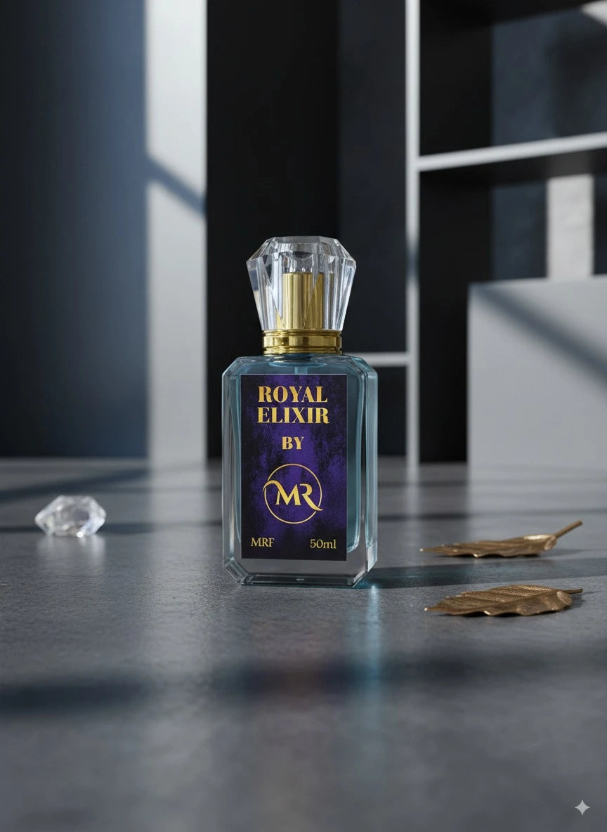 Step into the world of power and prestige with Royal Elixir . This bold and refined fragrance opens with a burst of fresh pineapple, bergamot, and blackcurrant, leading into a masculine heart of birch, jasmine, and patchouli. The scent settles into a deep and commanding base of oakmoss, ambergris, and vanilla, leaving behind an aura of true royalty.